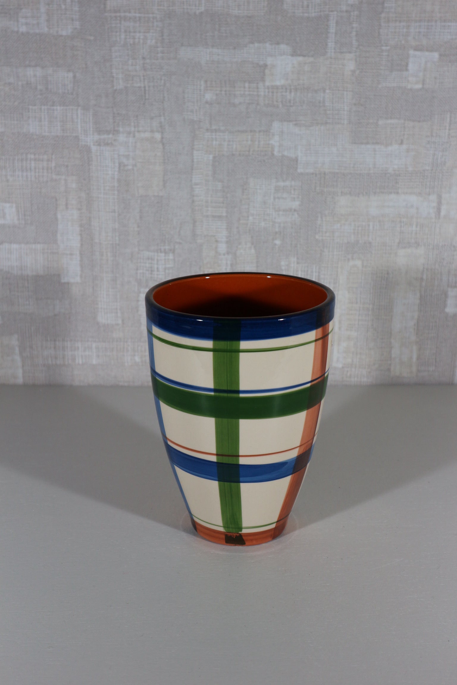 Hoge bloempot met een groen blauw ruit motief