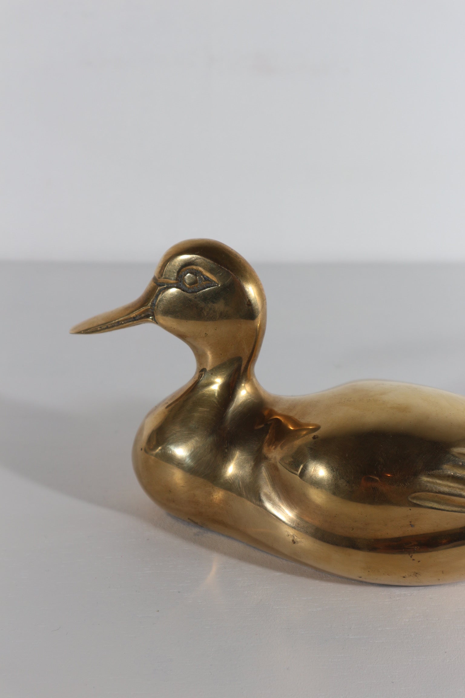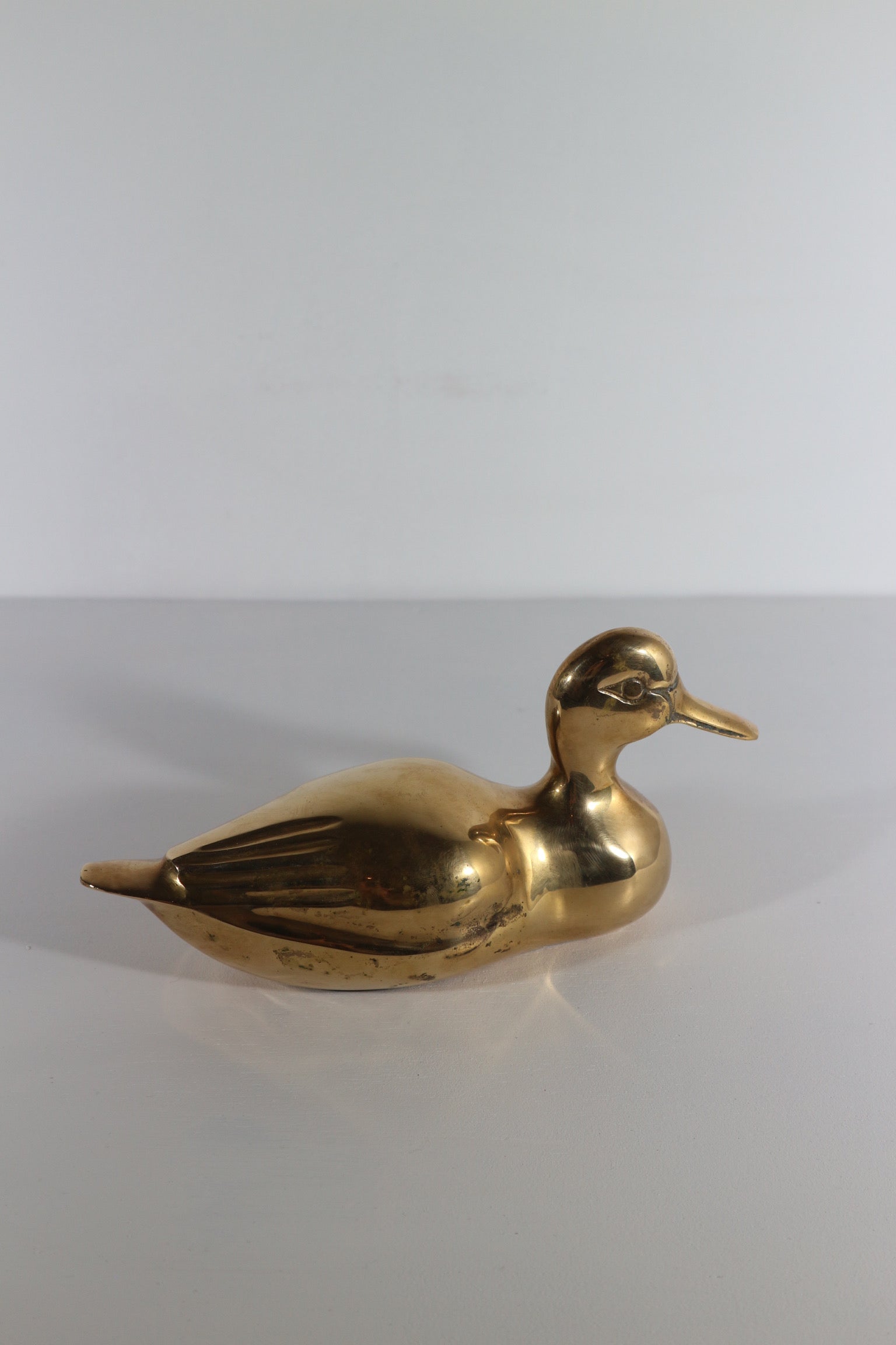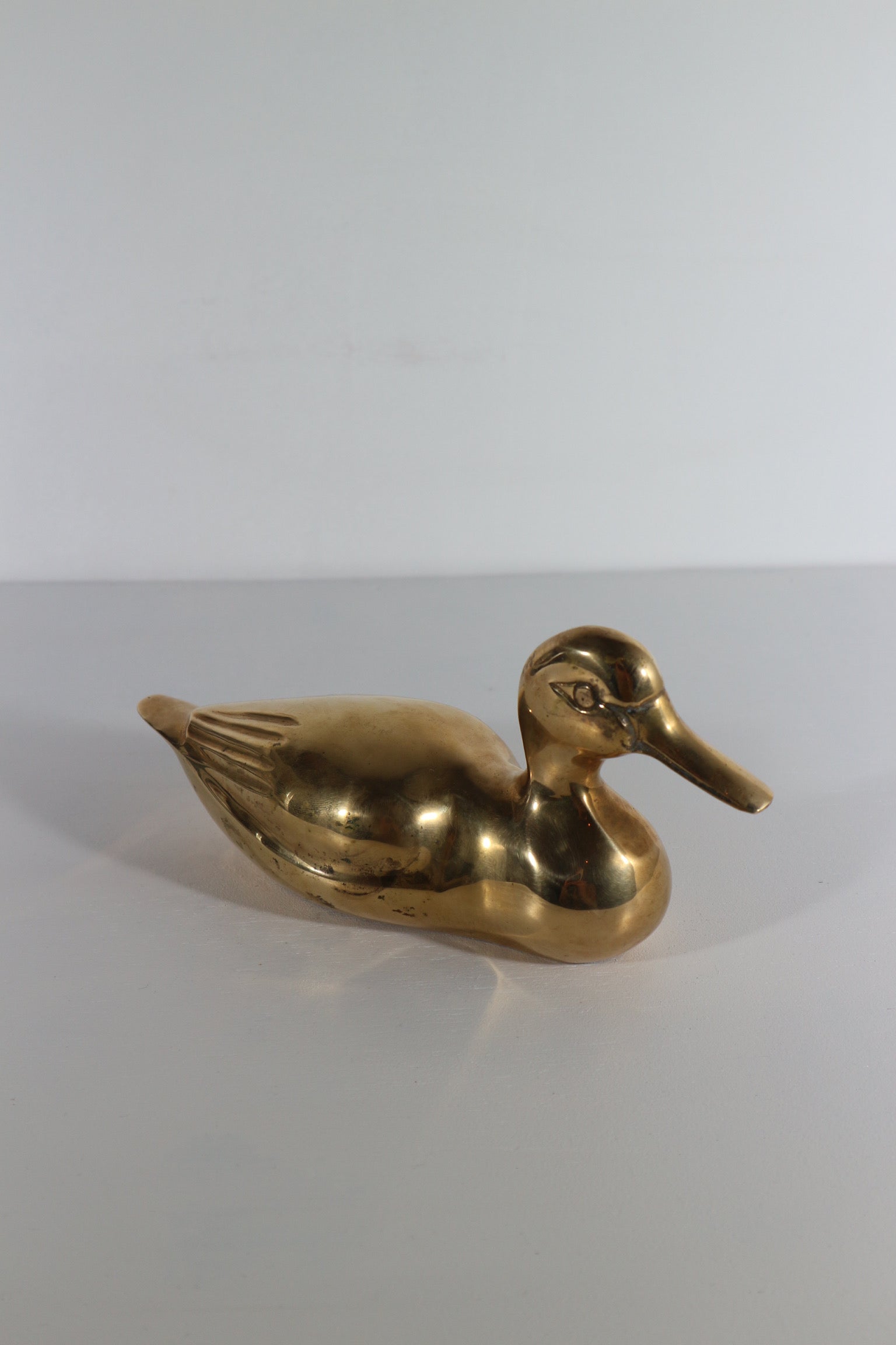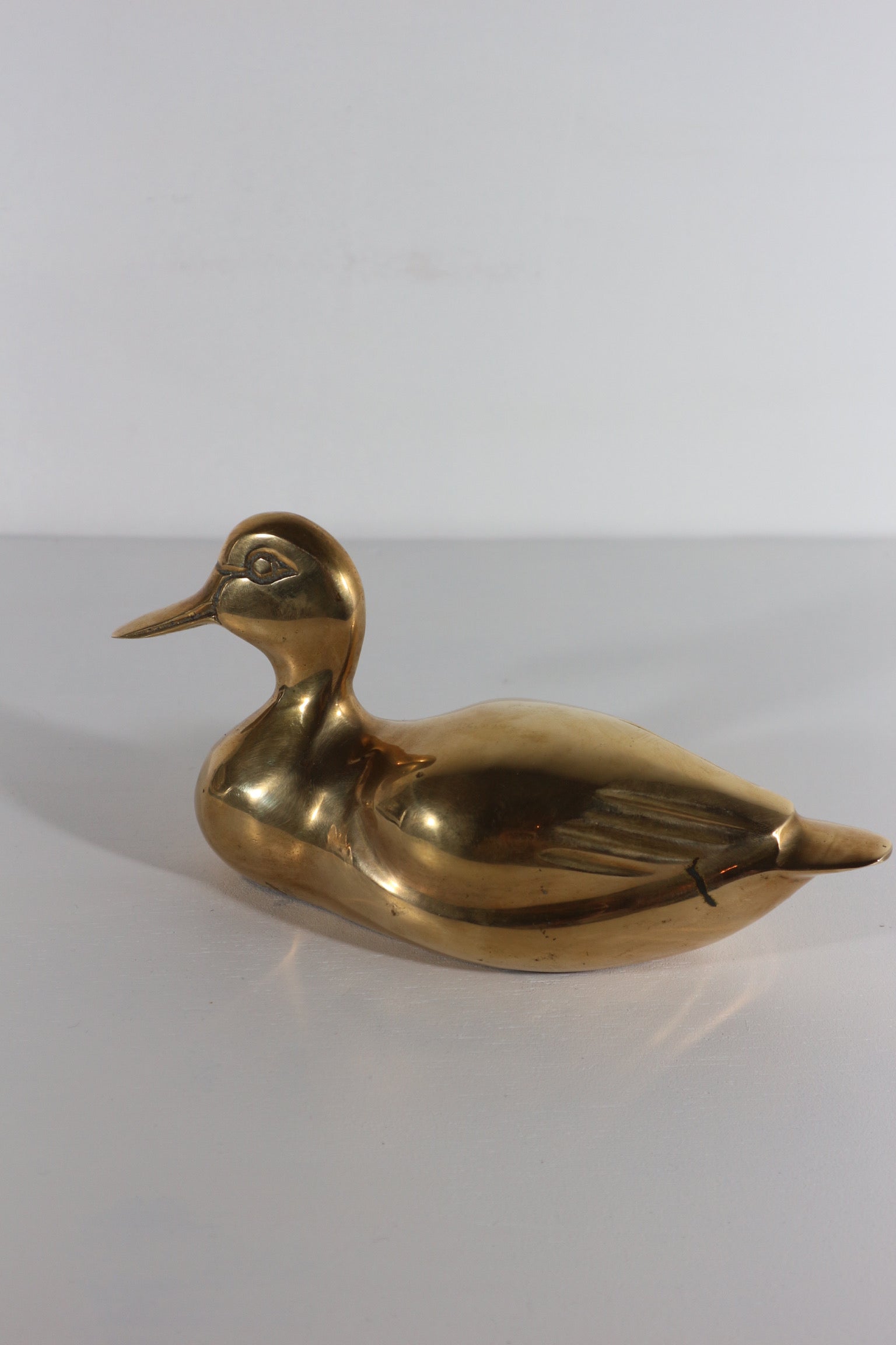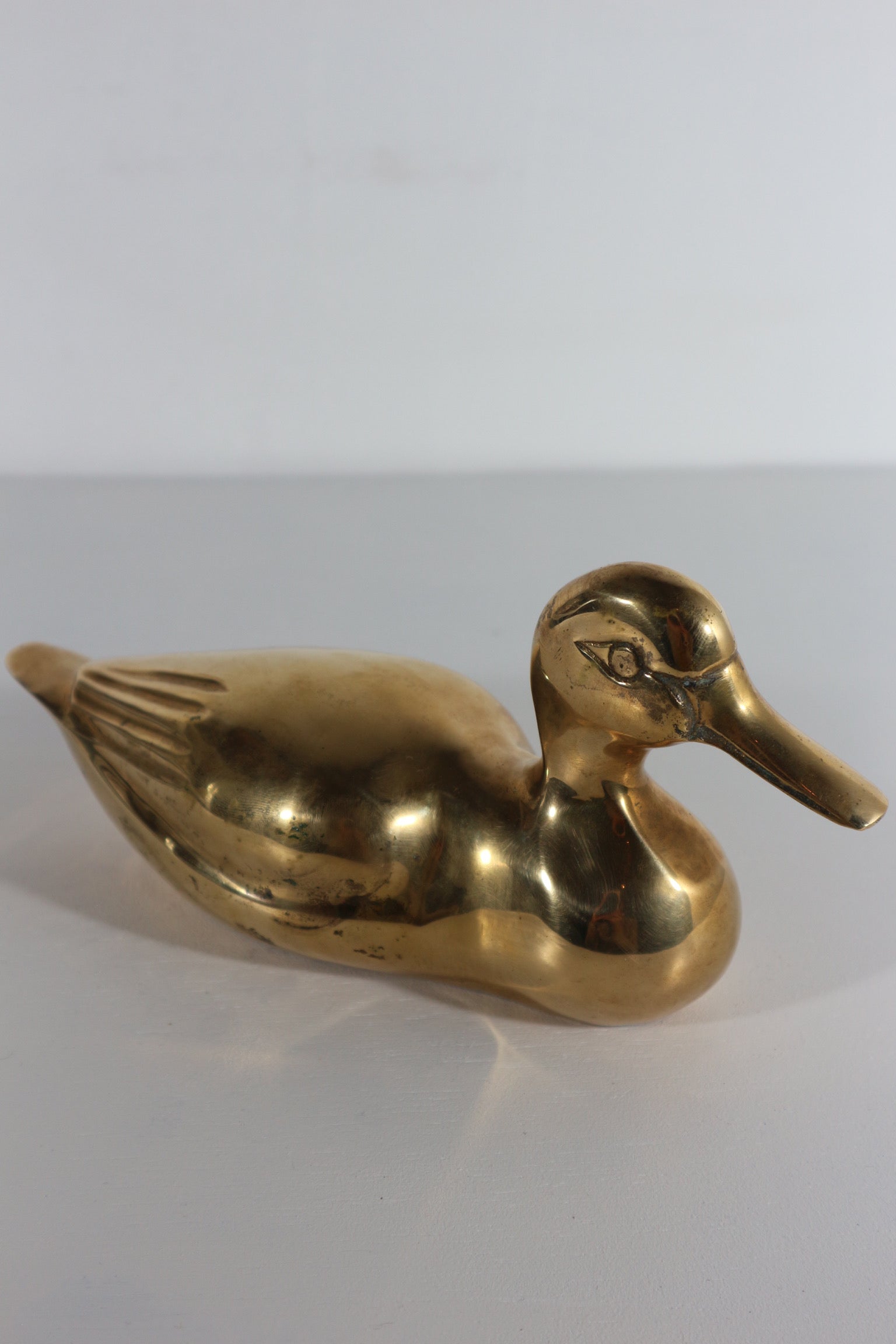 Een eend van messing. De eend is gepoetst, maar heeft hier en daar nog wat plekjes.