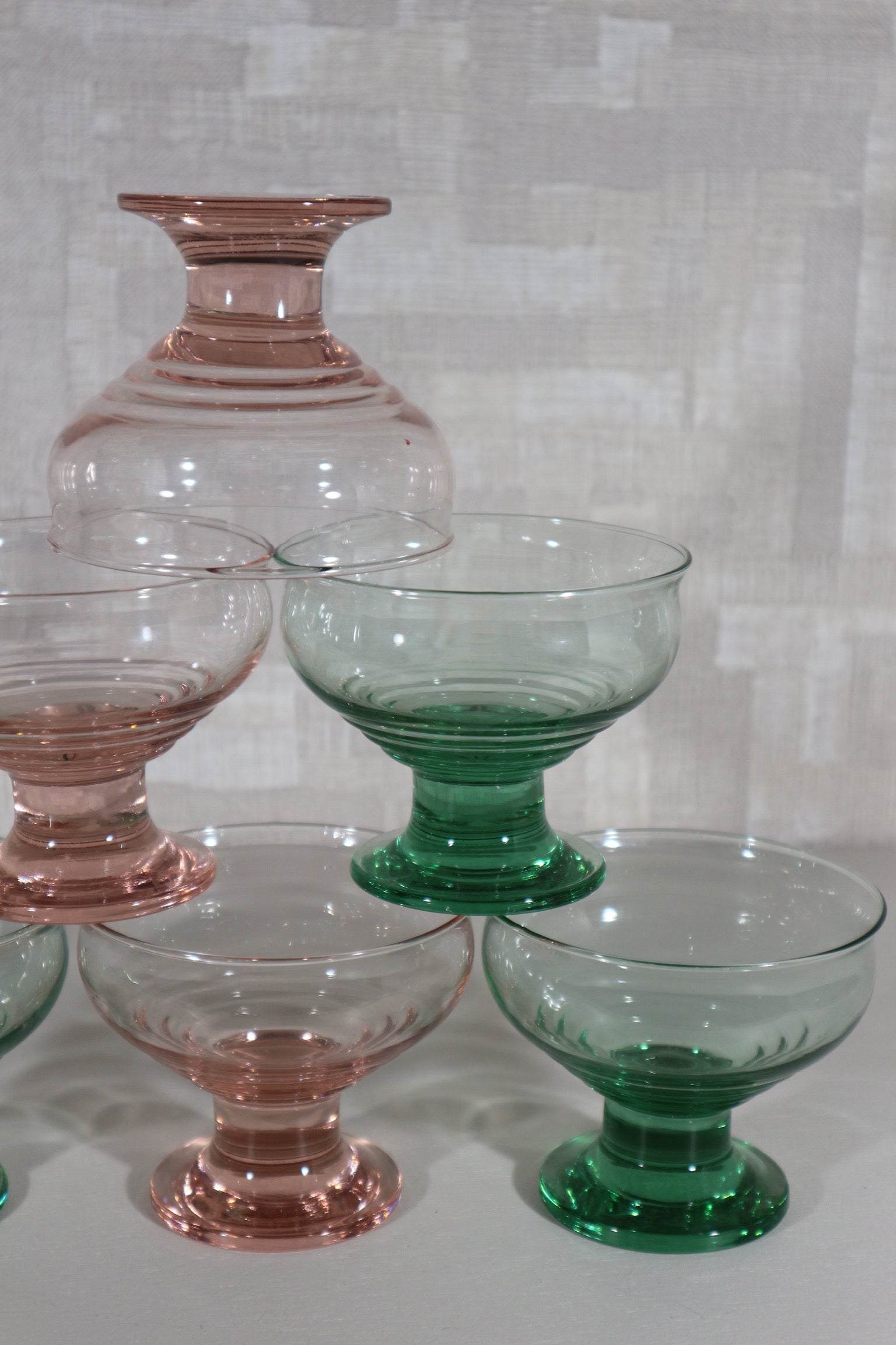 Set van zes ijscoupes, drie van roze glas en drie van groen glas.