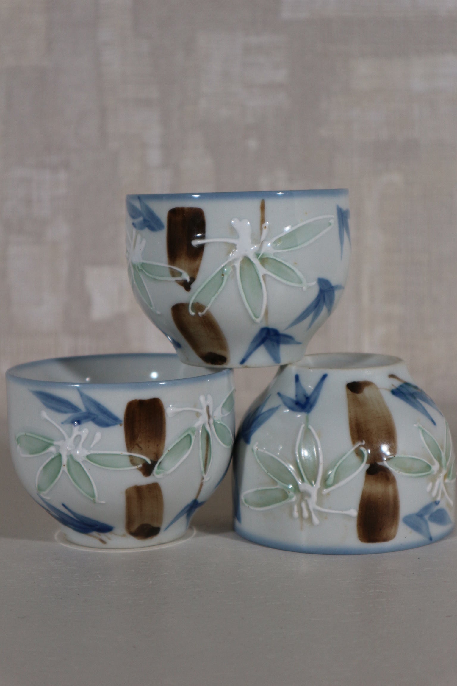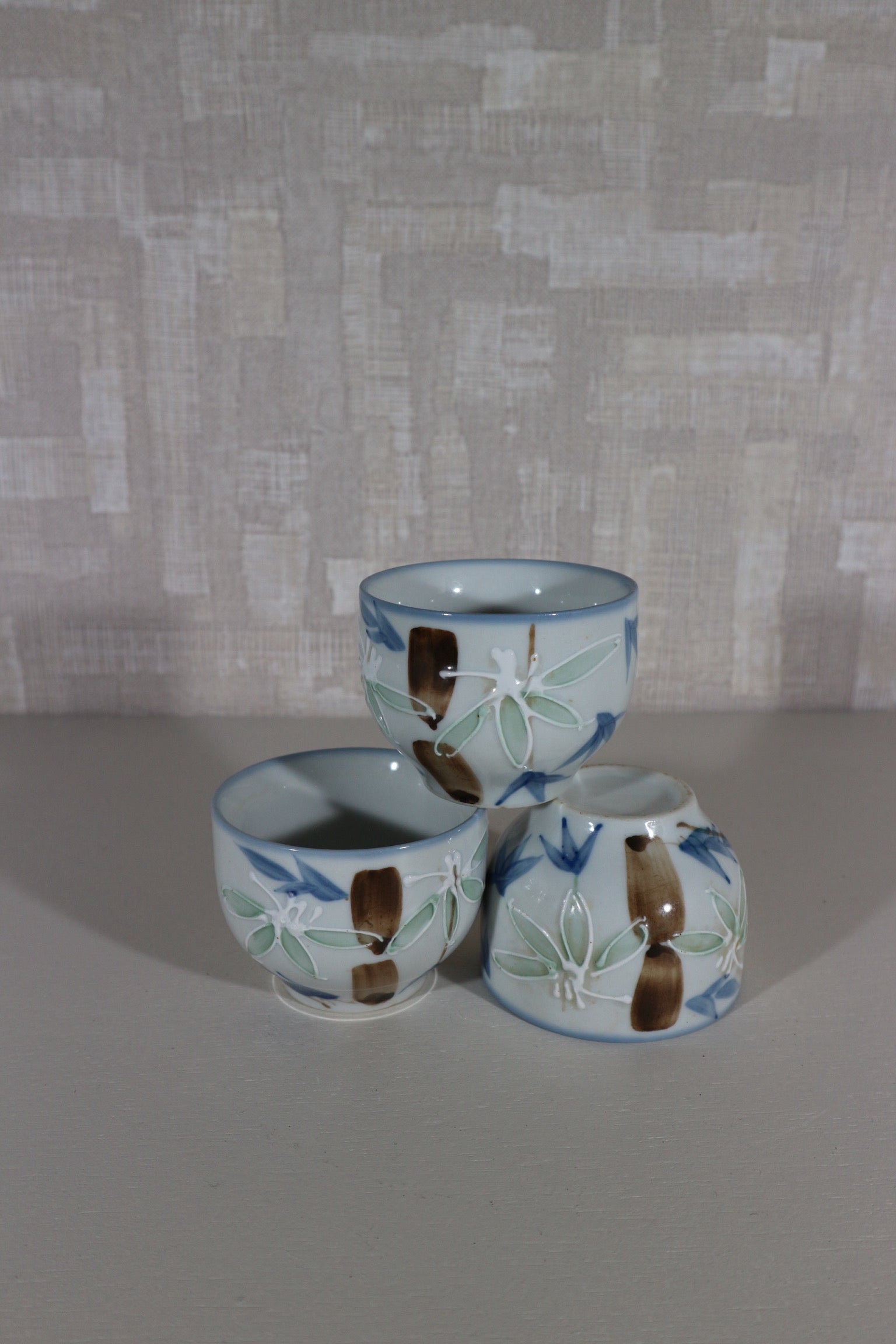 Setje van drie kleine hand geschilderde kommetjes.