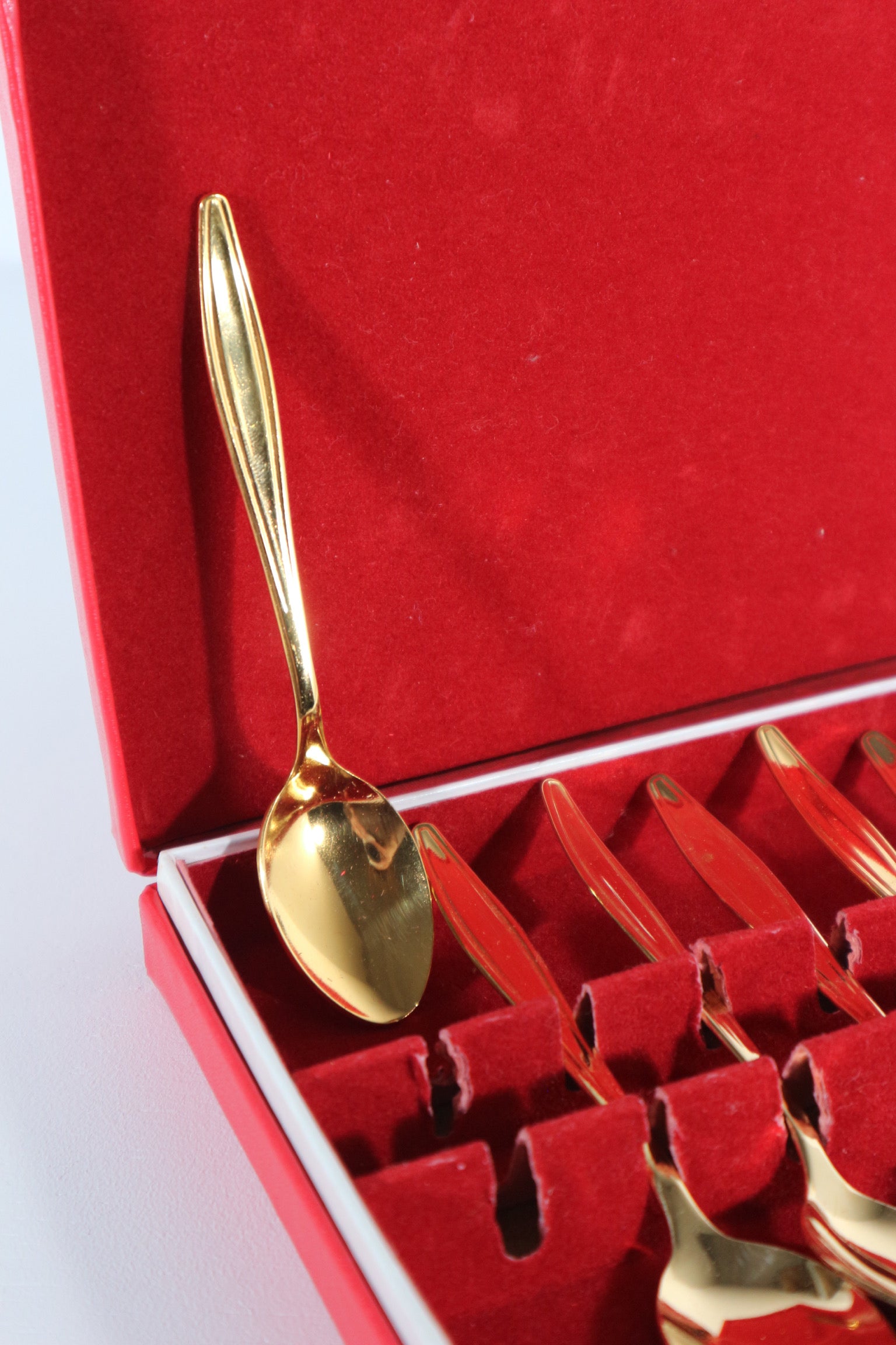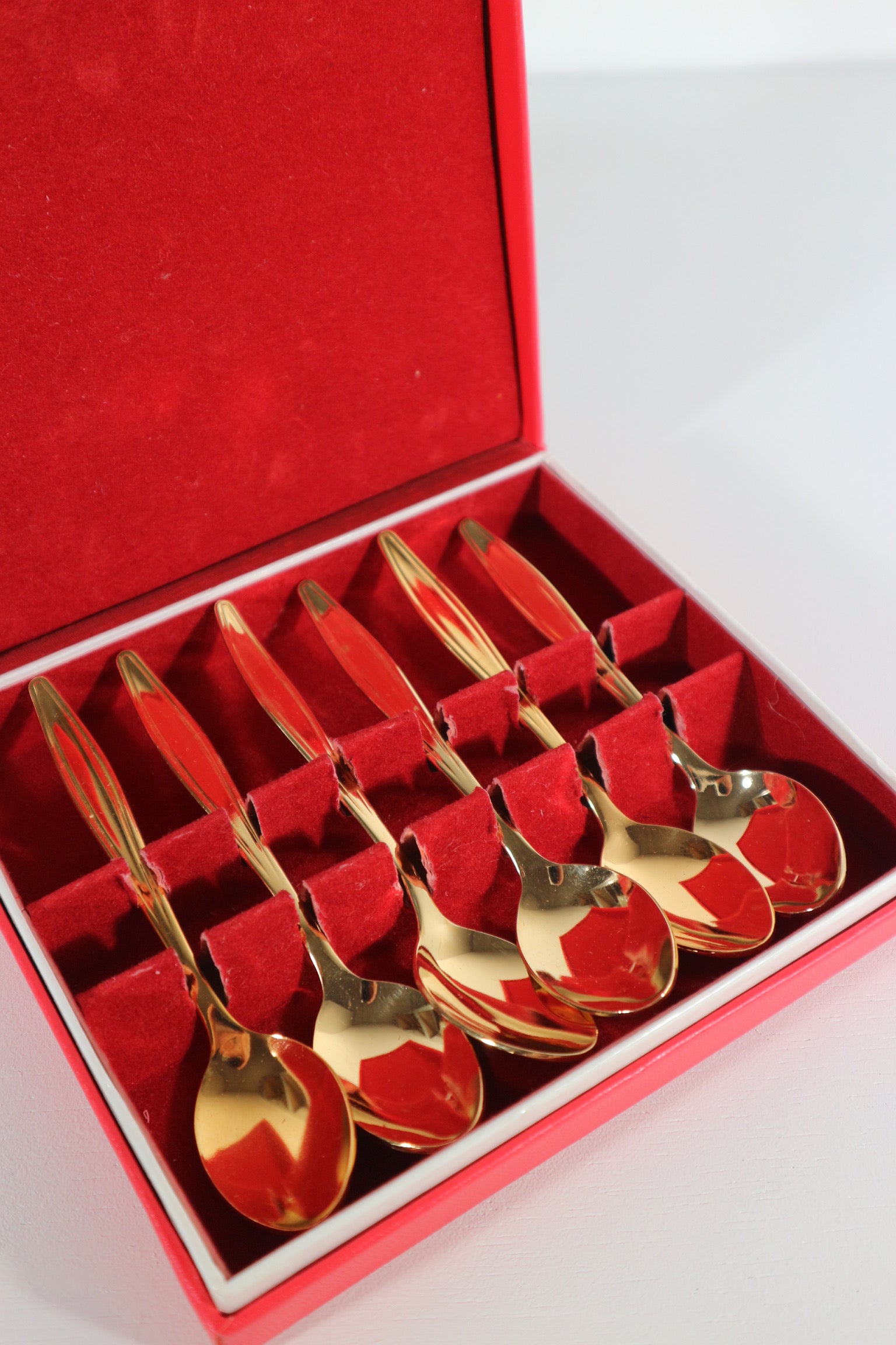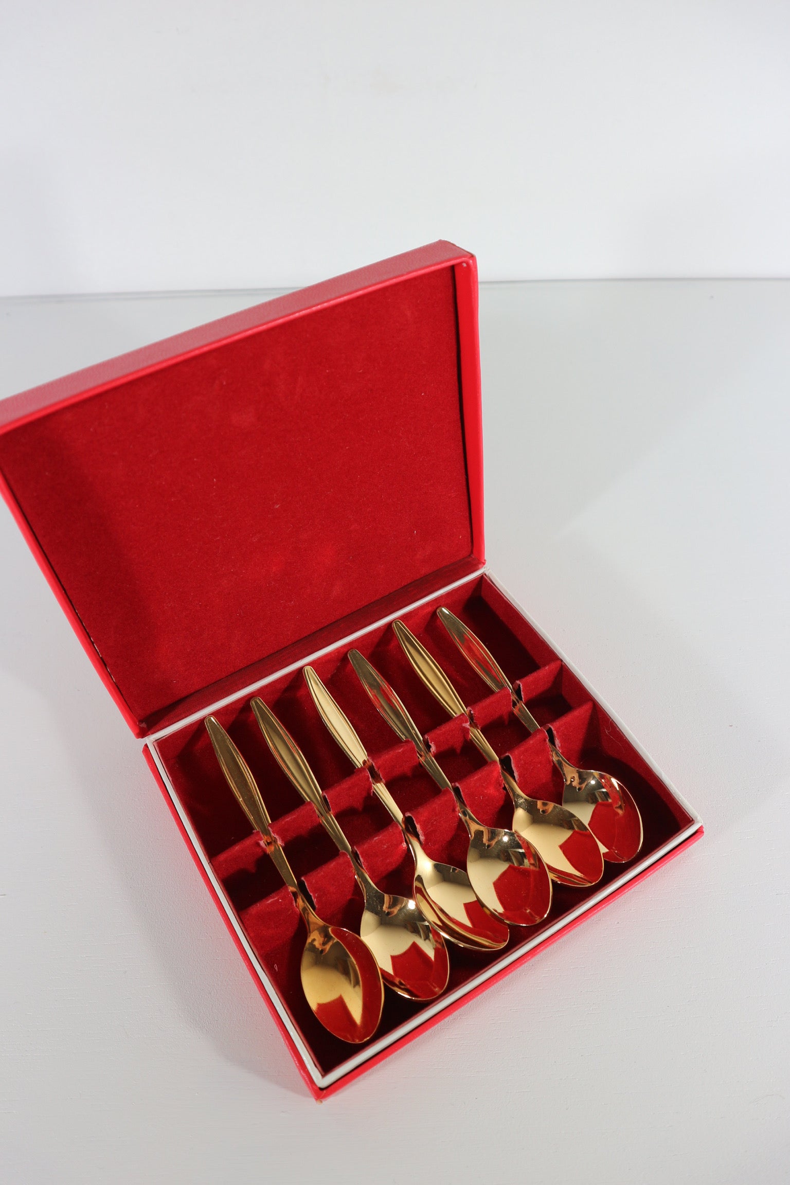 Set van zes goudkleurige koffie lepeltjes, in het originele doosje.