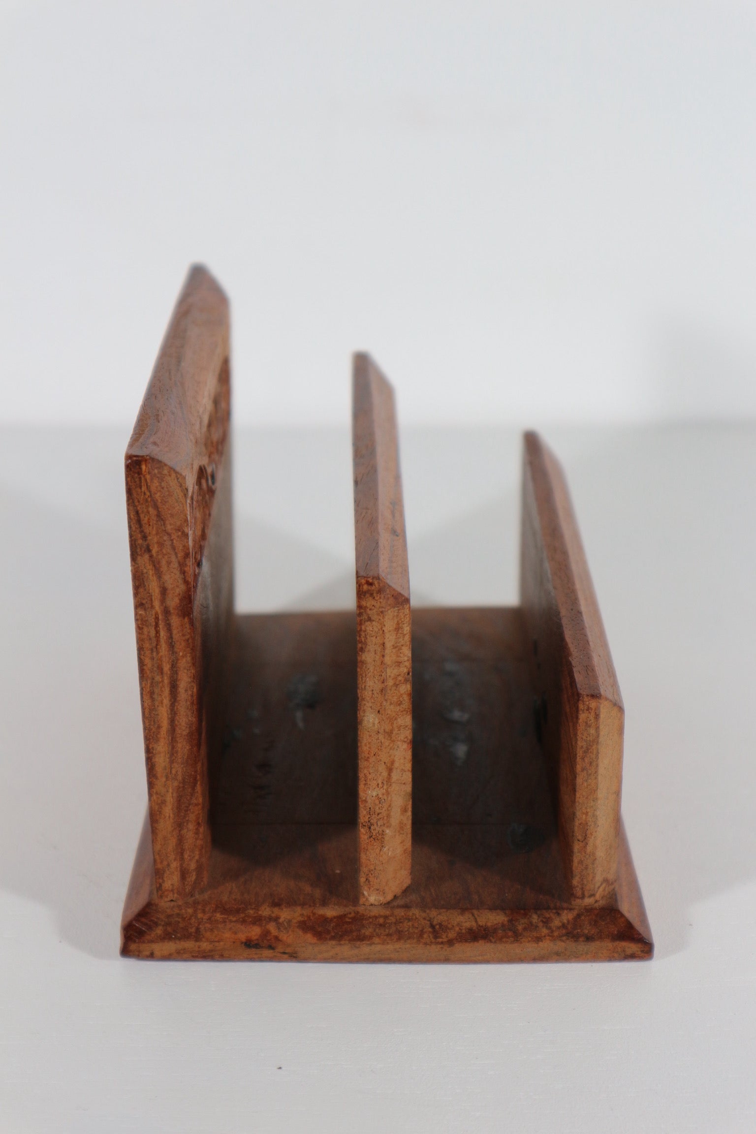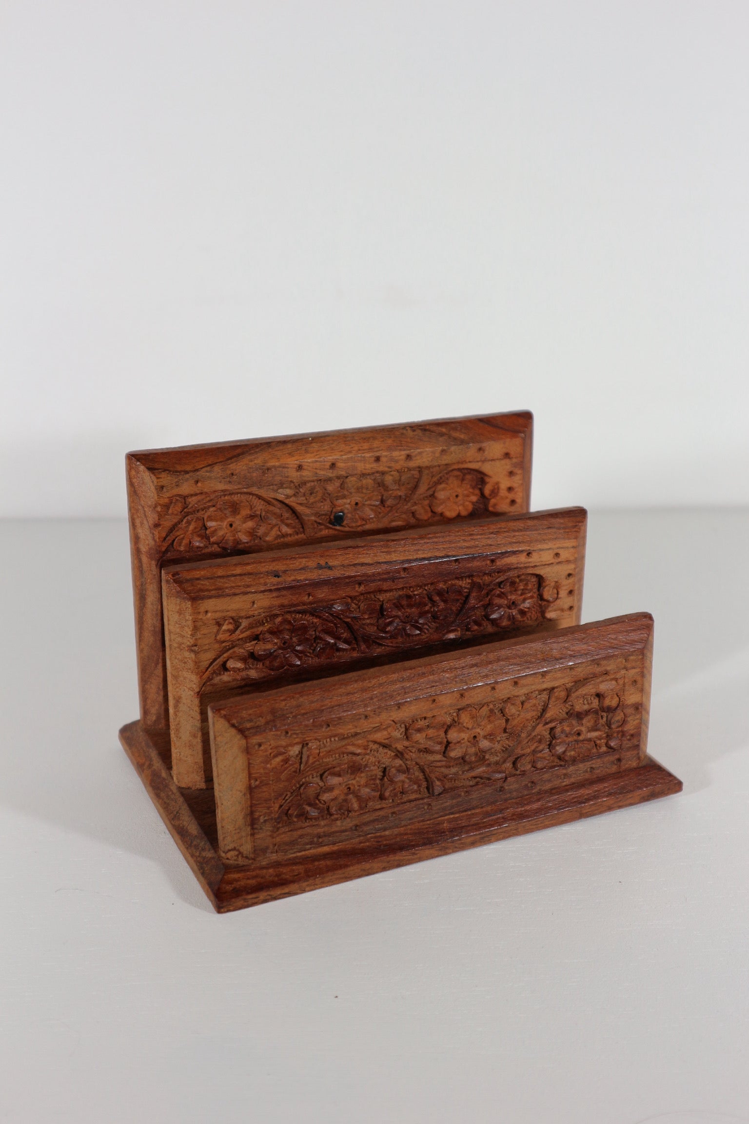 Houten brievenhouder, gedecoreerd met houtgesneden bloemen.