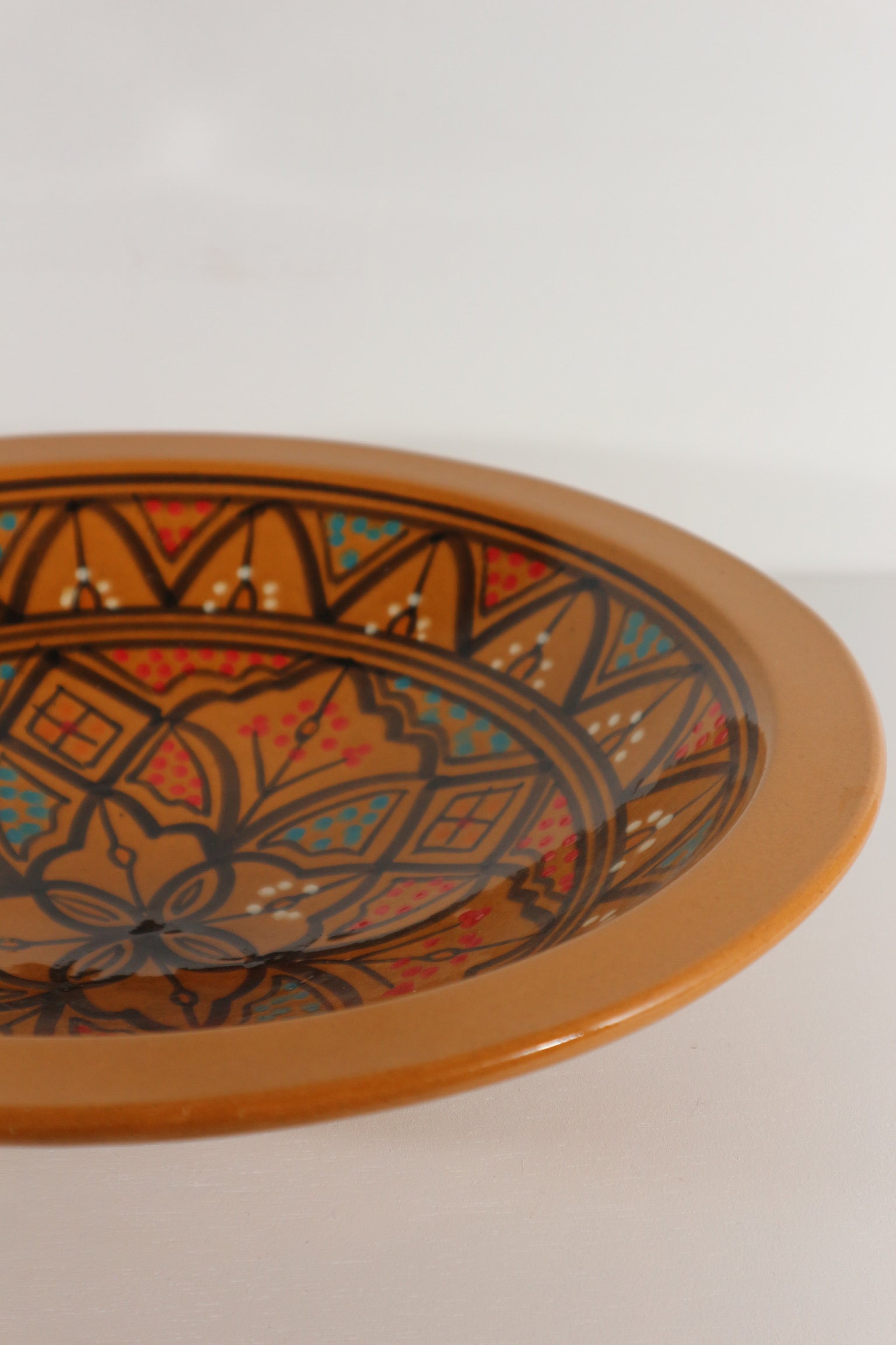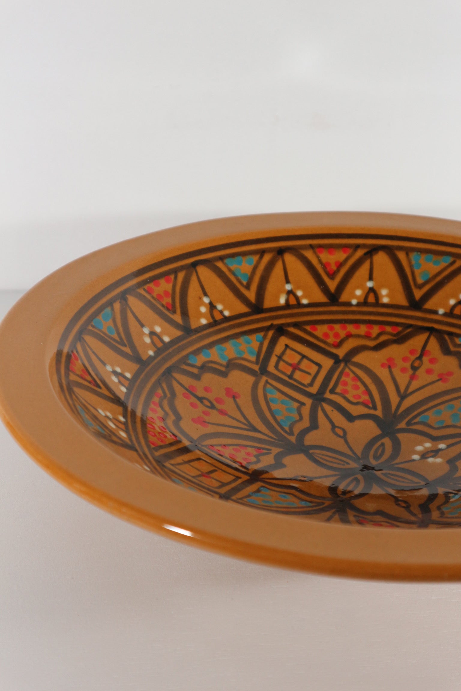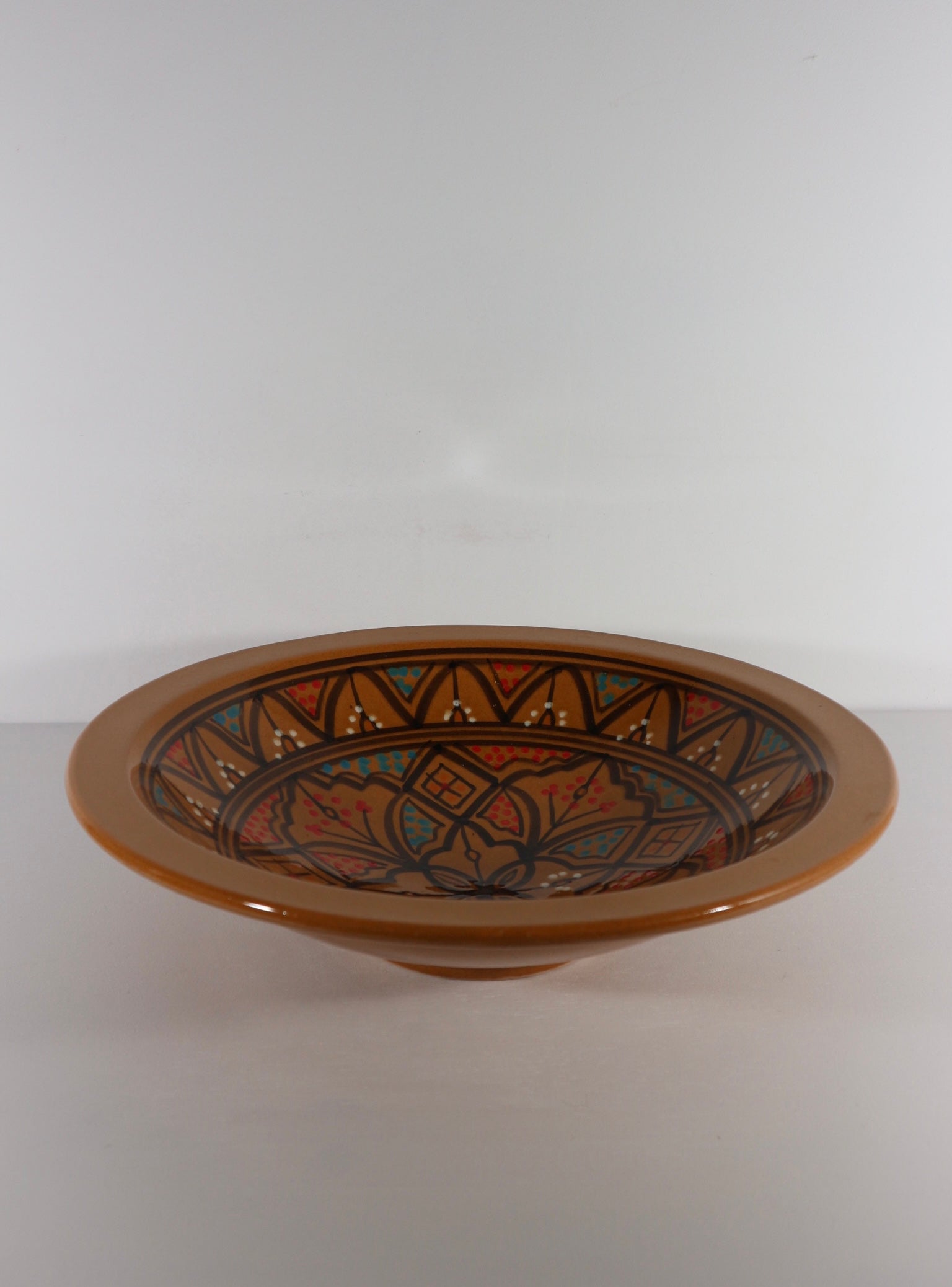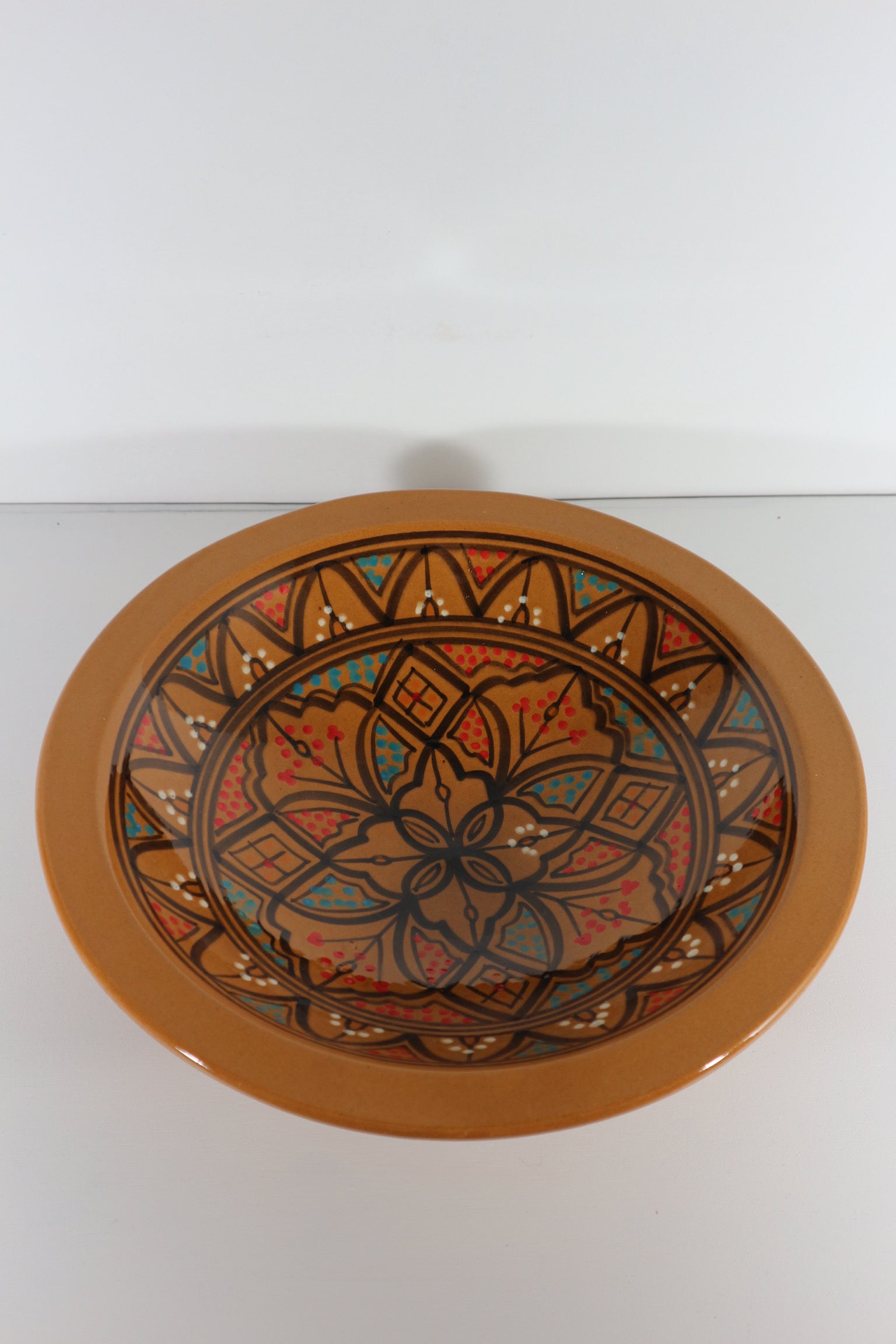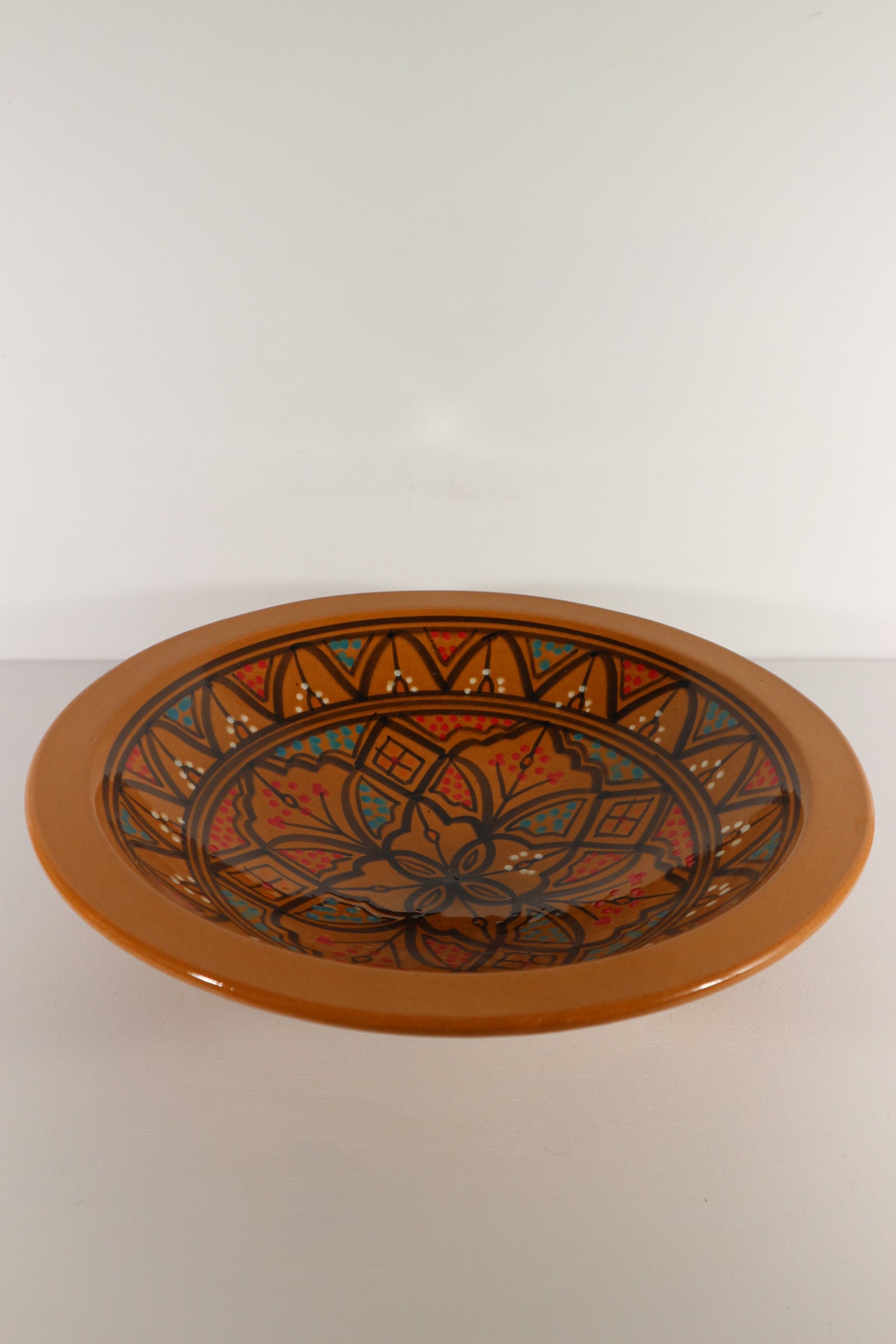 Een grote schaal van aardewerk. Versierd met gekleurde stipjes.